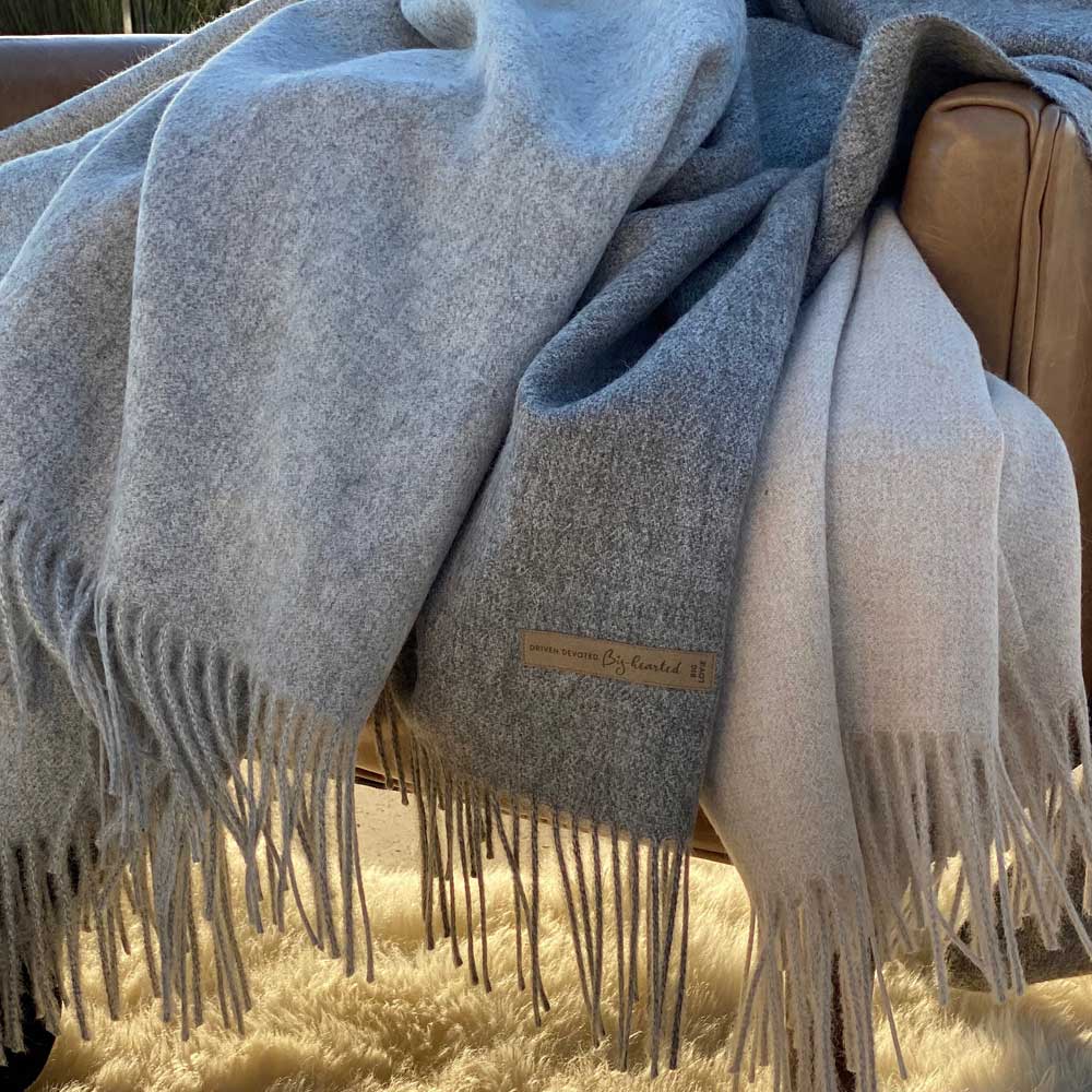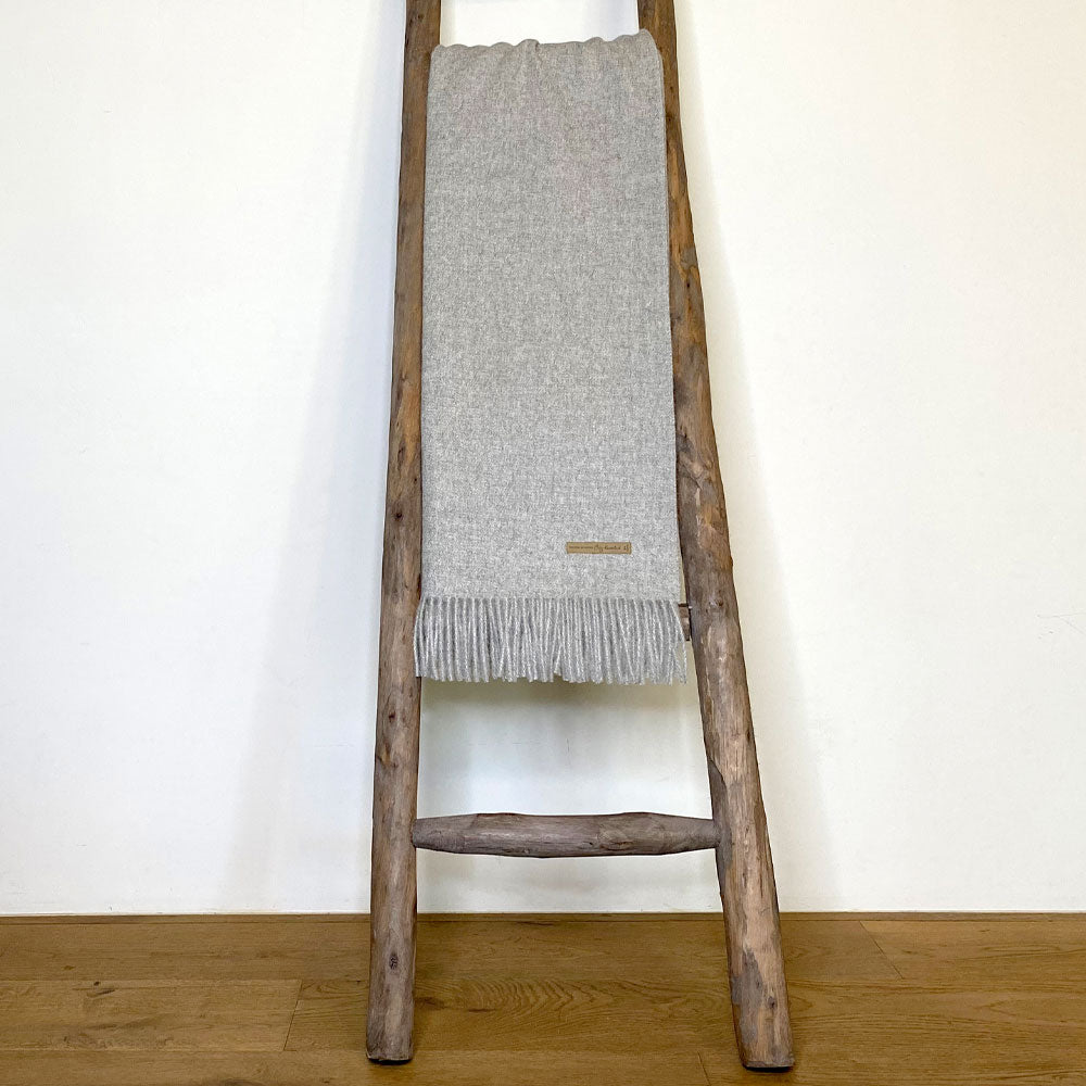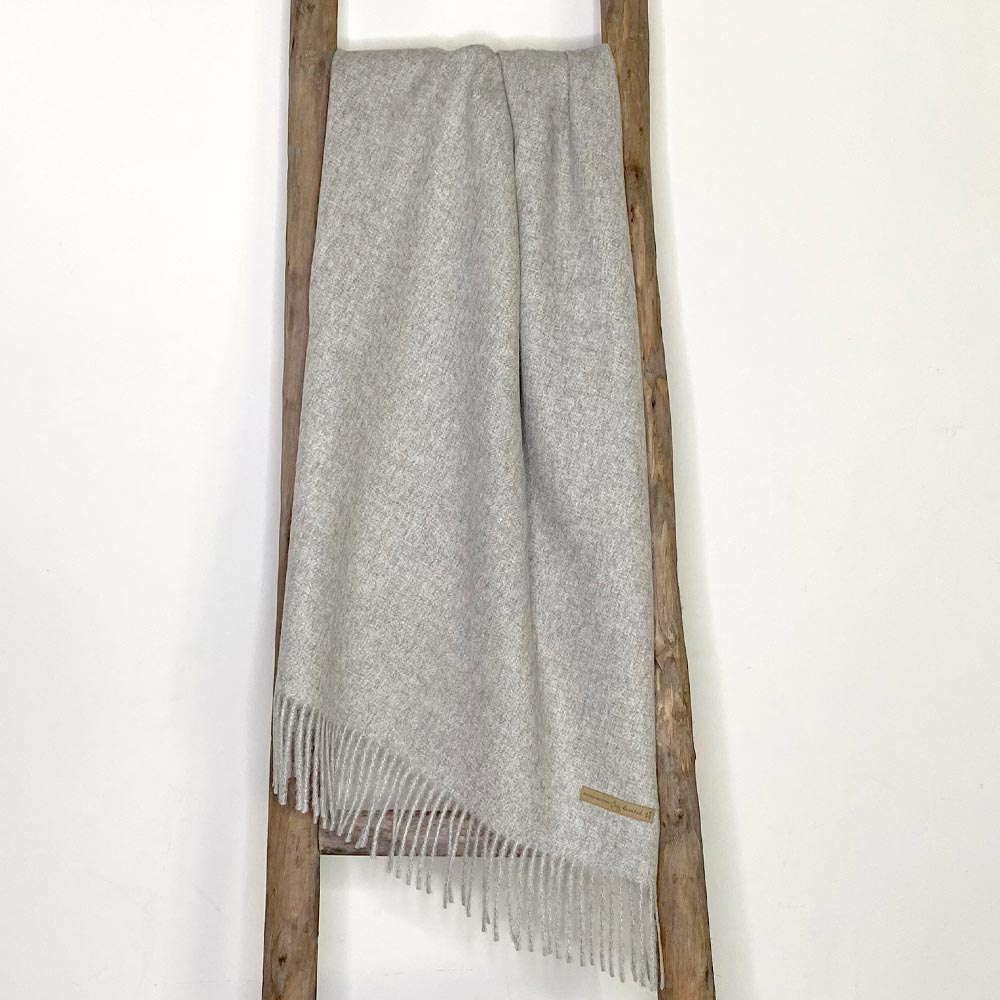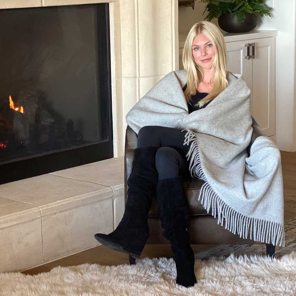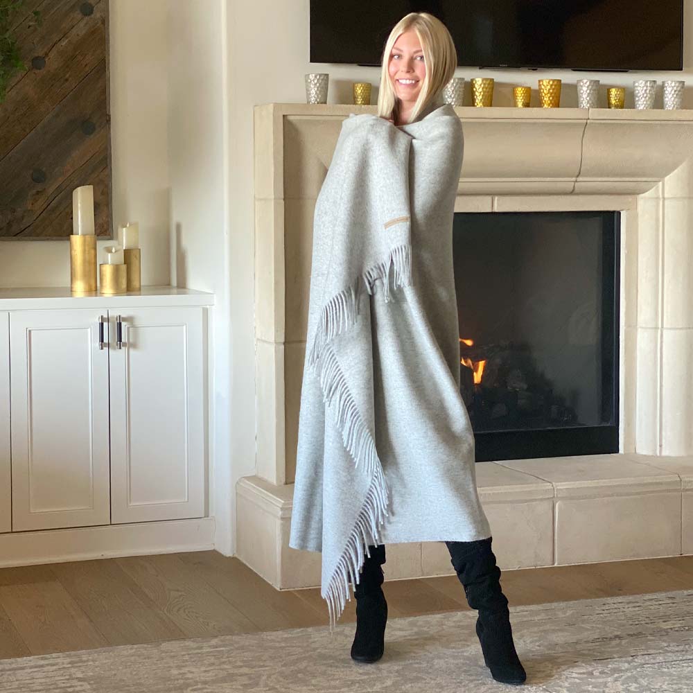 Handwoven by Andean artisans in Peru, the SOUL | KJ blanket embodies quiet strength and refined generosity. Its silver-heathered tones and soft fringe capture the balance between warmth and restraint—luxury without pretense.